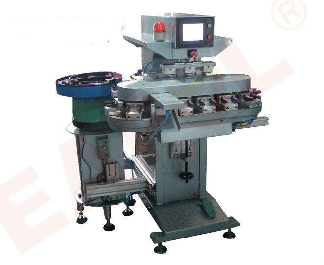 大多數移印機,尤其是大型移印機,一般都使用固定油盤和油盅,這類移印機的機械構造比較簡單卻很堅固。移印頭的進出由滑行組件帶動,由于印頭滑行組件所產生的撞擊,無可避免地會產生移印頭的震動,從而限制機體的印刷速度。