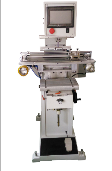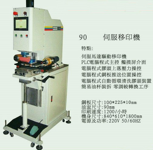 b.大型半自動移印機。大多采用電子電路控制執行部件,完成上墨、刮墨、膠頭提墨、再轉向工件的全過程。動作的速度和壓力都可調,也可由電腦設定,按既定要求重復作業。
